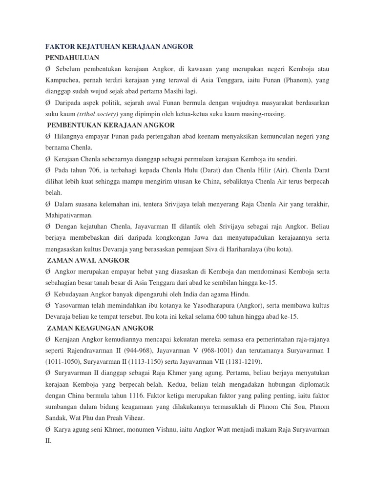 Faktor Kejatuhan Kerajaan Angkor from imgv2-1-f.scribdassets.com Taranya dapat dilihat pada kota angkor. Salah satu kerajaan yang pernah mencatat sejarah adalah kerajaan angkor. F3 kerajaan bertanggungjawab menguruskan sistem pengairan. F1 pembinaan sistem pengairan yang baik. Pada tahun 692 m, sriwijaya mengadakan ekspansi ke daerah sekitar melayu. F1 gunung jerai menjadi panduan kepada kapal /penanda alam. Pindahnya pusat kerajaan dari daerah pesisir ke pedalaman jawa tengah membawa pengaruh pada perkembangan islam di jawa khususnya perkembangan kerajaan aceh. Berkembang menjadi pelabuhan maritim 2.